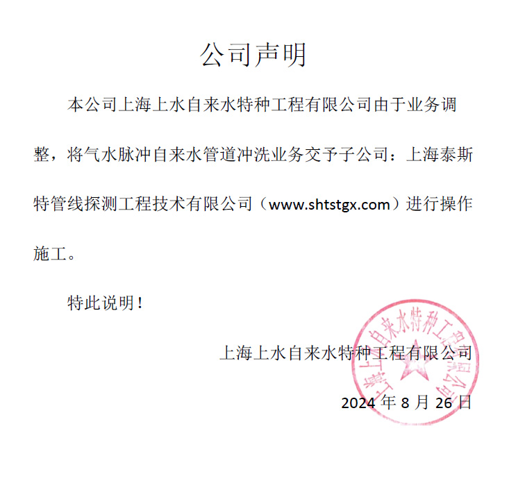 特别通知:上海上水自来特种工程有限公司(上水特种)由于业务调整,将气水脉冲水特种工管道冲洗业务交予子公司:上海泰斯特管线探测工程技术有限公司(www.shtstgx.com)进行推广施工。
