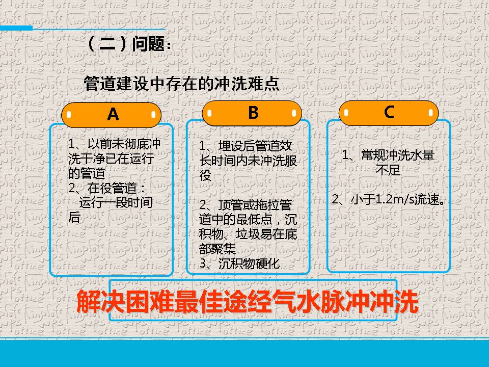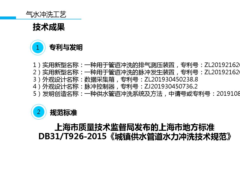 公司非常注重新工艺新技术的开发研究,其中气水脉冲管道冲洗技术在同行中处于相对领先的稳定地位。公司参与了自来水管道冲洗上海地方标准的编著,在气水脉冲管道冲洗领域中拥有多项专利,并拥有上百项施工案例,为国内集理论和实践一体的气水脉冲管道冲洗的专门公司。在激烈的市场竞争中,我们始终以“科技创新,创新发展,服务社会”的核心价值观立足市场,竭诚欢迎全国各地的同行指教和交流。