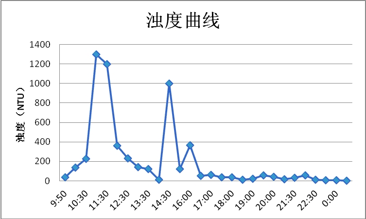 因上述无法取水样的原因,第三段冲排了8小时左右,然后第三段与第四段串联在一起冲洗,最终以二泐港桥排放口水样为准。第三段与第四段共加气量12902 m3,气水混合比2.15/1,流速大于1.11m/s,采样共23,该串联冲洗段未出现水样反复现象,最高浊度128度持续半小时,从66.9度~40.7度持续3小时,40.7度~13.7度持续3小时, 13.7度~3.96度持续3小时,2.01度~0.8度持续1小时。