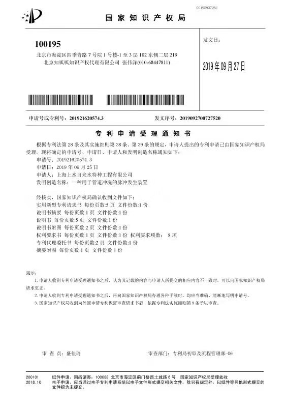 专利受理 关于“气水脉冲管道冲洗技术”,上海泰斯特管线探测工程技术有限公司5项专利申请已在2019年9月份被国家知识产权局受理。