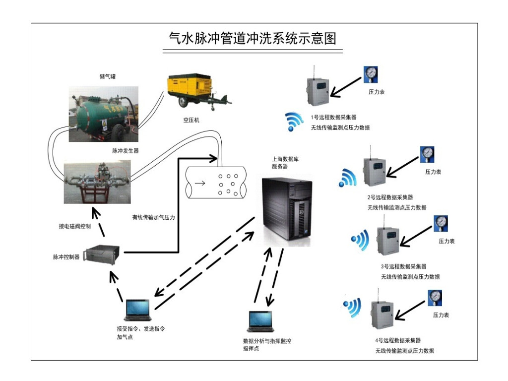 气水脉冲管道冲洗施工设备除了采用空压机、储气罐、脉冲控制器和脉冲加气机等硬件设备外,还采用了现场数据采集、数据远程传输和反馈、以及远程服务器监控和现场电脑操作控制等IT技术,使整个管道气水脉冲施工进行得有序和可控,从而保证了冲洗安全和冲洗质量。